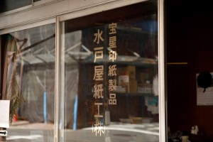 「宝星印」は水戸屋紙工のオリジナルのブランド名。扉のガラスに残された金文字が老舗の誇りと歴史を物語っています。