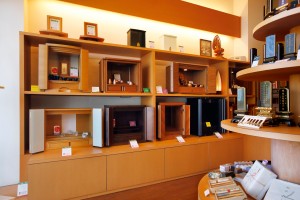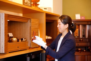「昔はご家庭に仏間がありましたので、昔ながらの伝統型仏壇が大半を占めておりました。それが、時代の変遷とともにライフスタイルも大きく変わり、お部屋のデザインも多様化しておりますので、当店でもそれらにうまく調和するような商品を取り揃えております。最近では、箱型のお仏壇ではなく、ご供養のためのスペースをコンパクトに設けられるメモリアルステージや壁掛け仏壇などを希望される方もお越しになります。ご供養のカタチも幅広いため、個々のお客様のご要望にお応えできるような品揃えを心掛けております」と販売担当の準子さんは話します。